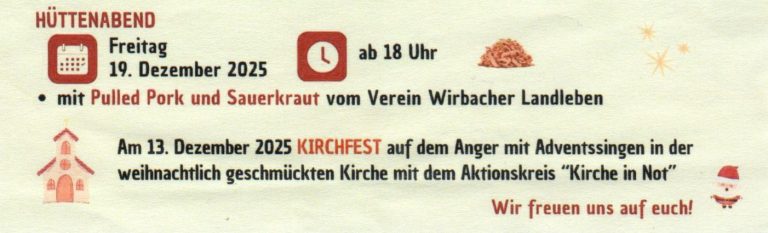Kirchfest mit Adventssingen am Samstag, 13.12.2025 um 14:00 Uhr in unserer geschmückten Kirche in Unterwirbach. Im Anschluss Glühwein und Gebratenes !