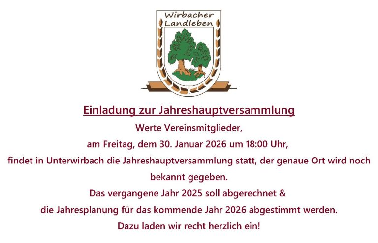 Am Freitag, den 30. Januar 2026 findet im Vereinshaus Unterwirbach die Jahreshauptversammlung des Vereins "Wirbacher Landleben" e.V. statt. Beginn ist 18:00 Uhr.