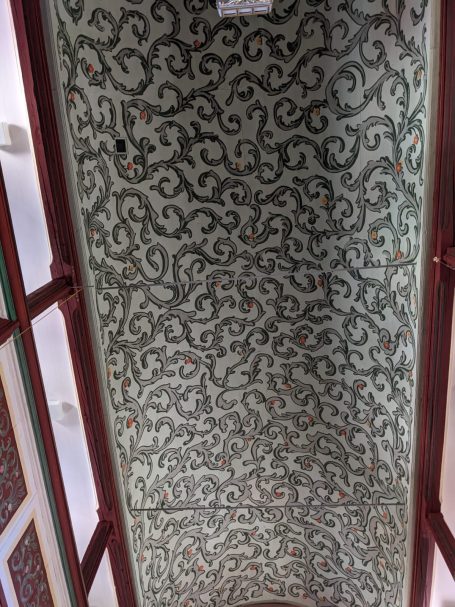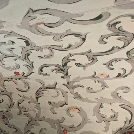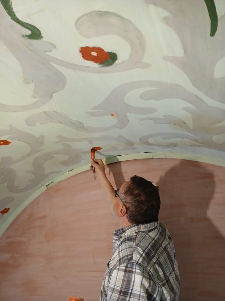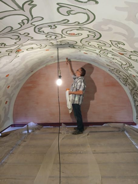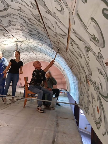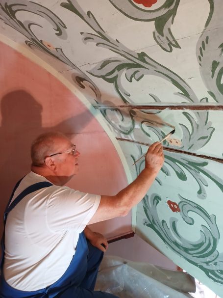 Die Decke wurde gereinigt, lose und abblätternde Leimfarbschichten aufwendig beseitigt, Fugen und Risse geschlossen. Am Ende strahlen die Akanthus-Ranken und kleinen Blüten der Deckenmalerei wieder hell und leuchtend.